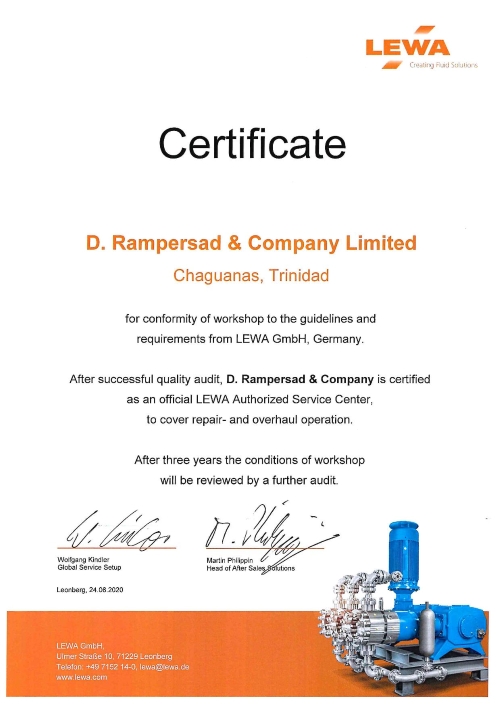 December 21, 2021We are proud to announce that we’ve been awarded the full Authorised Service Centre certification for LEWA pumps in Trinidad & Tobago, Guyana and Suriname.